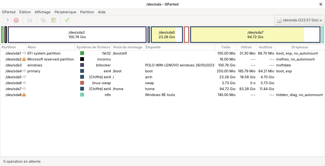 Cet exemple est une capture de mon PC de voyage. Le système linux utilise une partition /home séparée rendant toute réparation plus simple. Il devient possible de sauvegarder ou restaurer la partition système sans toucher aux données.